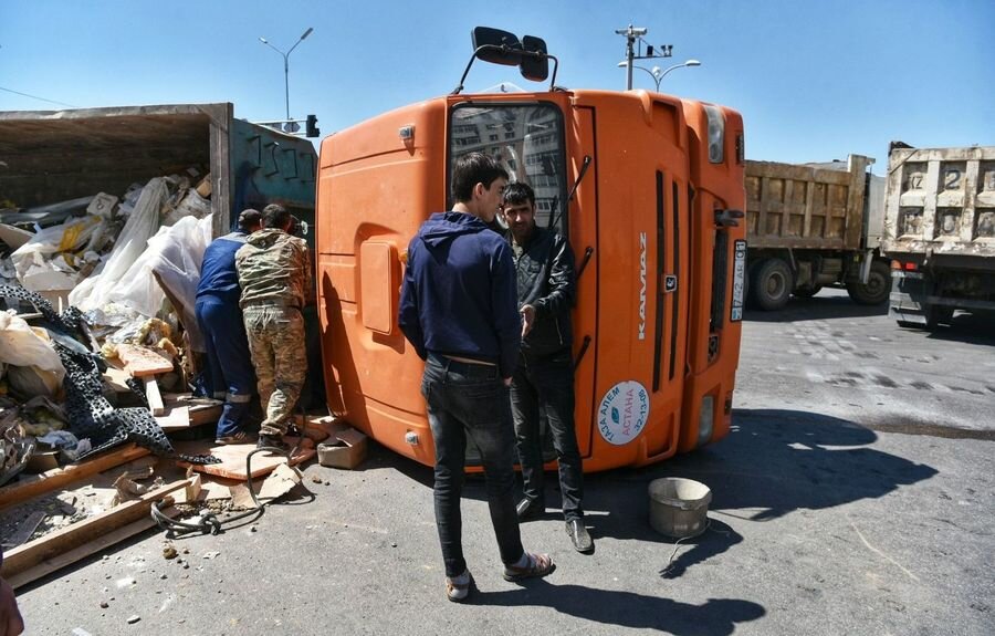 КамАЗ с мусором перевернулся на одной из оживленных улиц столицы